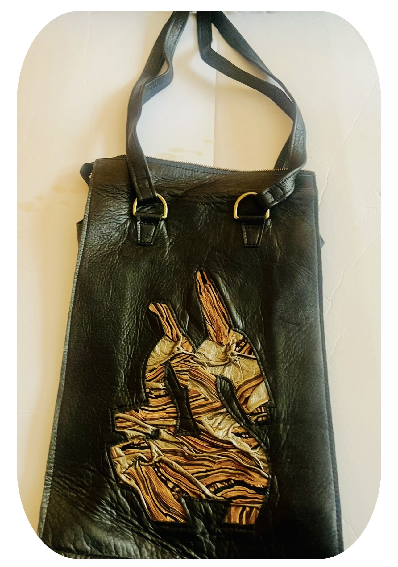 Dr. Clayton Lang was a renaissance man and is well known for his use of leather in his art.  He also incorporated adinkra symbols and the chi wara figure in his large and small bags.